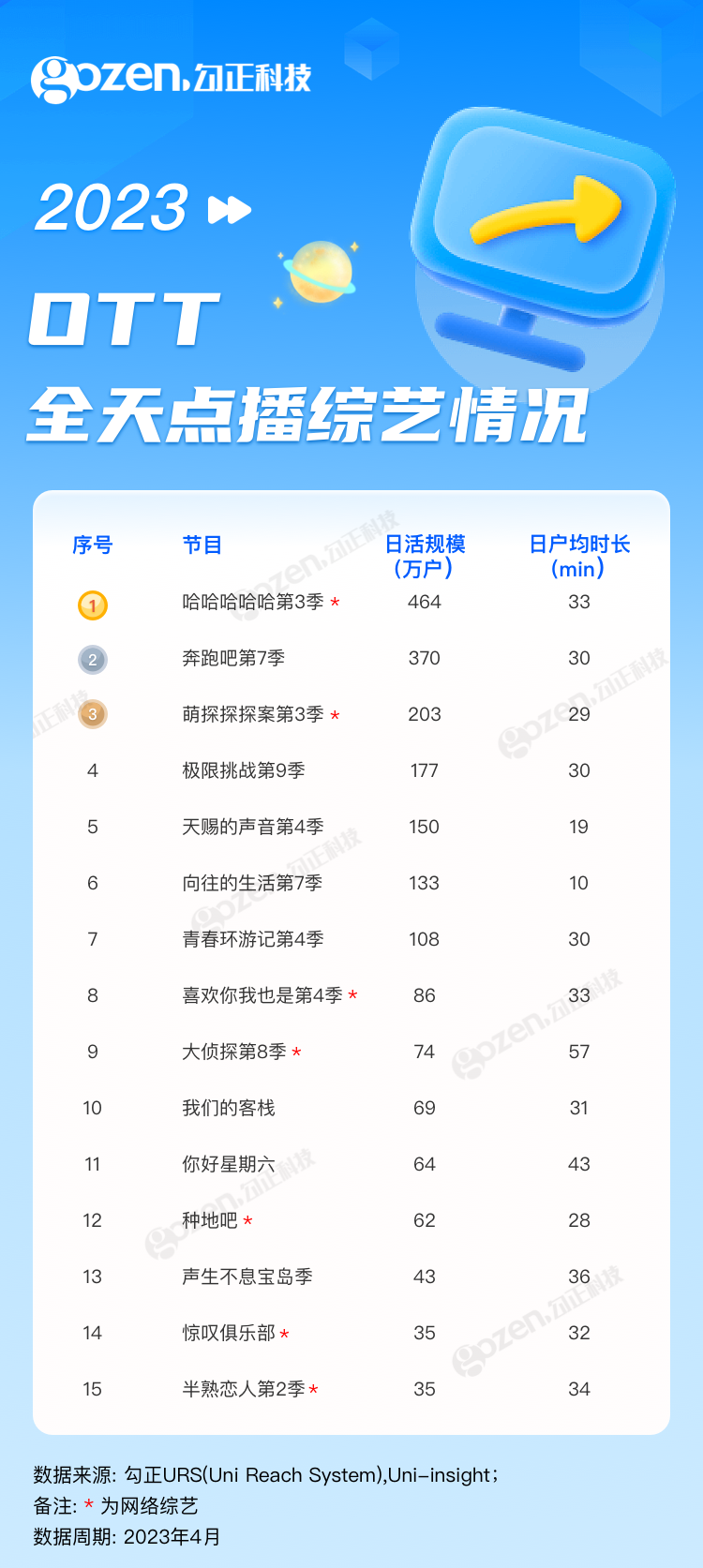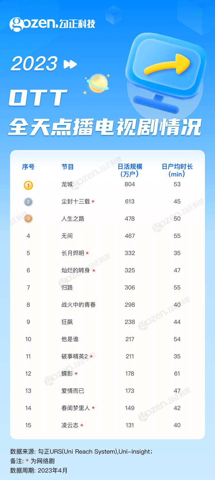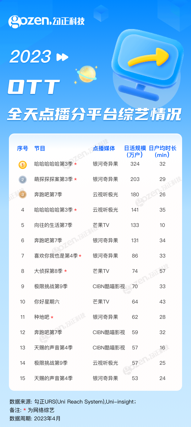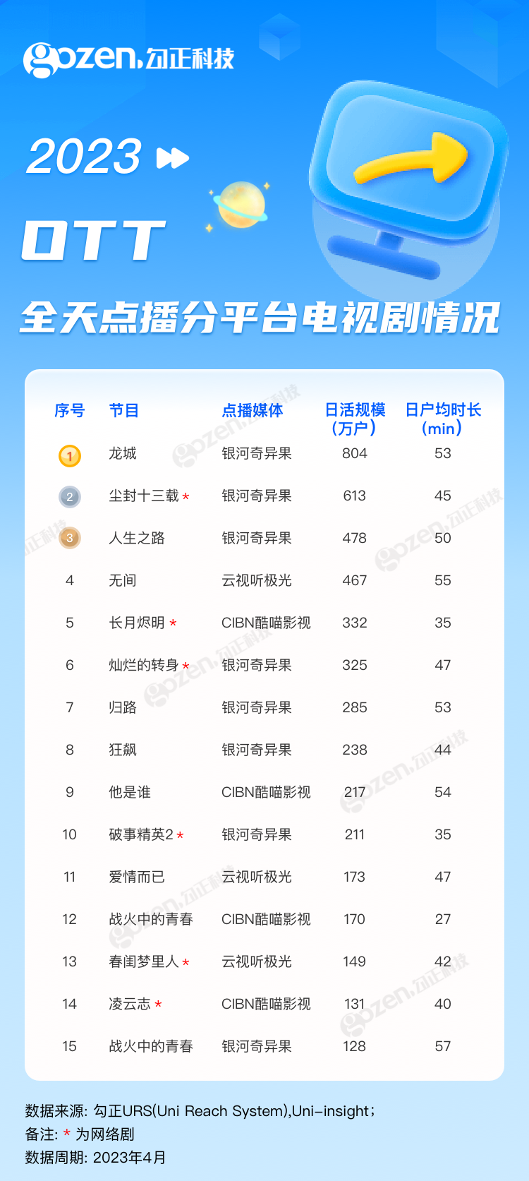 4月,悬疑、近代革命、年代等多类型题材电视剧全面开花,凸显多元化,且收视表现强劲亮眼,揽获了市场高关注度。整个综艺市场也势头迅猛,经典综N代、“她综艺”、文化主题节目、音乐综艺等多品类节目接连定档,综艺市场也爆发了蓬勃生命力和发展空间。下面就跟随勾正科技的脚步来看看4月1日-4月30日OTT点播节目的播出情况吧!