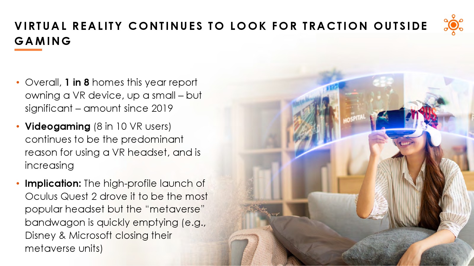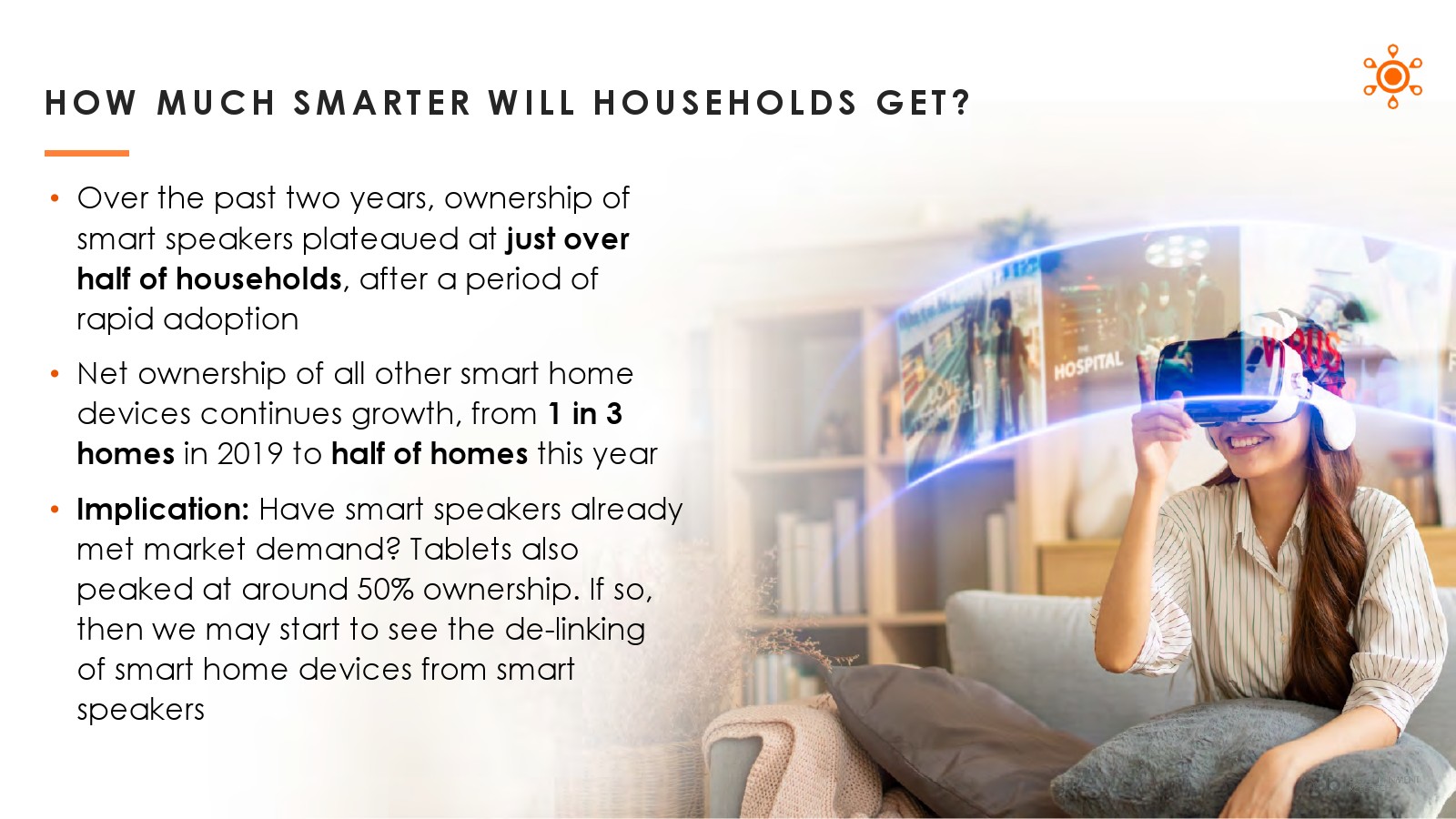 相比之下,根据Hub的报告,智能音箱的拥有量似乎处于稳定状态。这也与最近的研究一致,智能音箱的普及率增长正在放缓。在过去两年,经过一段时间的快速普及,智能音箱在美国的普及率稳定在略高于一半的家庭。