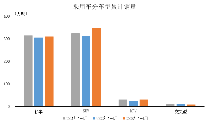 2023 年 1-4 月,在乘用车主要品种中,与上年同期相比,除交叉型乘用车销量两位数下降外,其余三大类车型销量均呈不同程度增长。