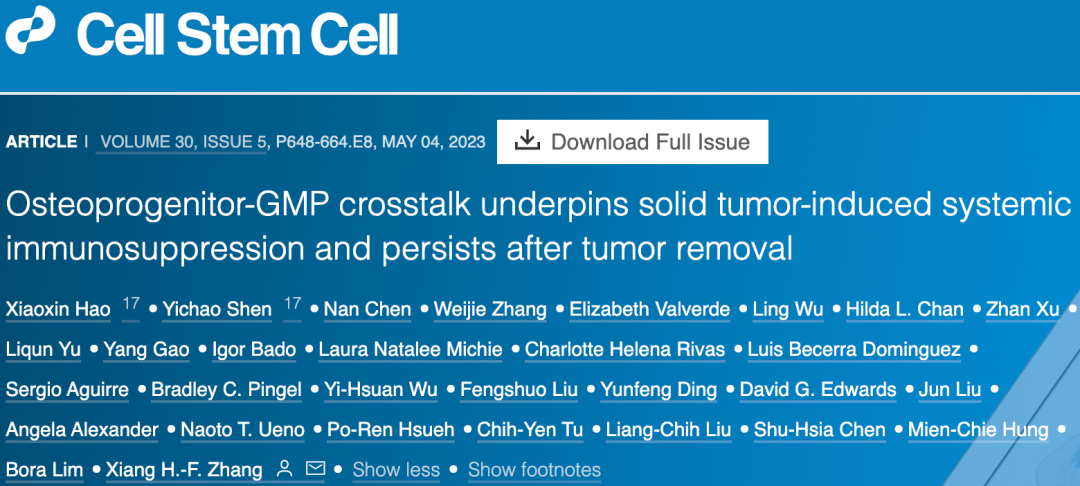 [1].Hao X, Shen Y, Chen N, et al. Osteoprogenitor-GMP crosstalk underpins solid tumor-induced systemic immunosuppression and persists after tumor removal. Cell Stem Cell. 2023;30(5):648-664.e8. doi:10.1016/j.stem.2023.04.005
