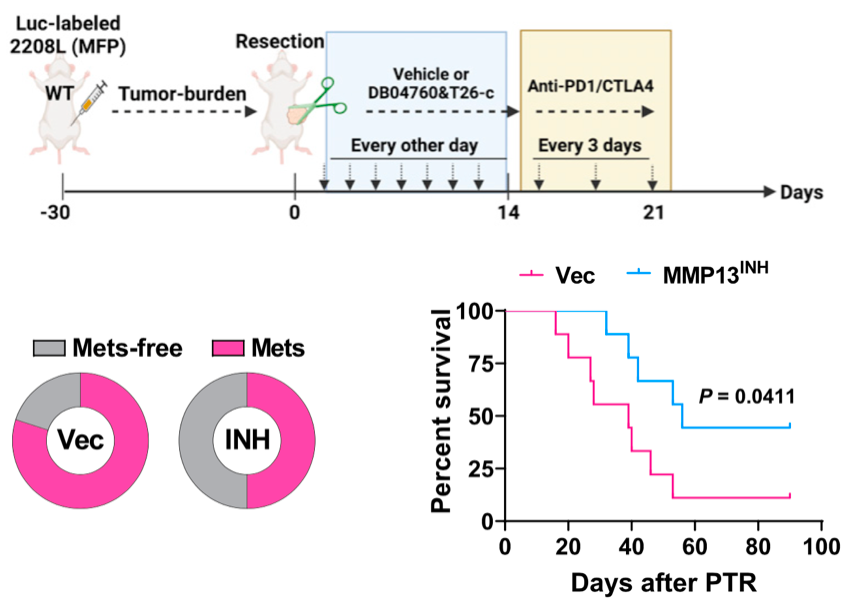 好消息是,他们发现术后用MMP-13抑制剂(CL-82198)干预,就可以恢复抗肿瘤免疫。在与免疫检查点抑制剂联用的情况下,可以降低自发性肺转移发生率,并明显改善肿瘤切除后小鼠的生存率。
