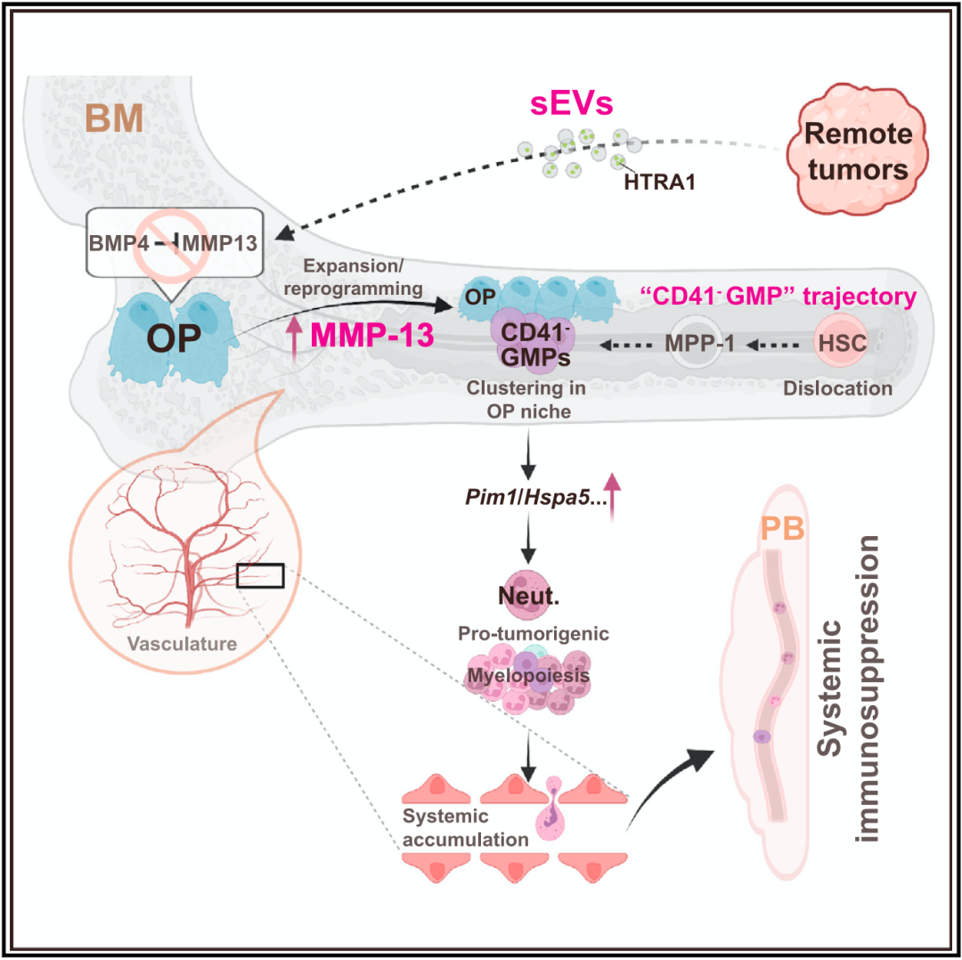 简单来说,癌细胞释放的含HTRA1外囊泡进入骨髓之后,会被骨祖细胞(OPs)吞噬,导致骨祖细胞的MMP-13表达上调,骨祖细胞的成骨分化和增殖同时增加,破坏骨髓微环境,导致造血干细胞分化成CD41阴性GMP和髓细胞过度产生。
