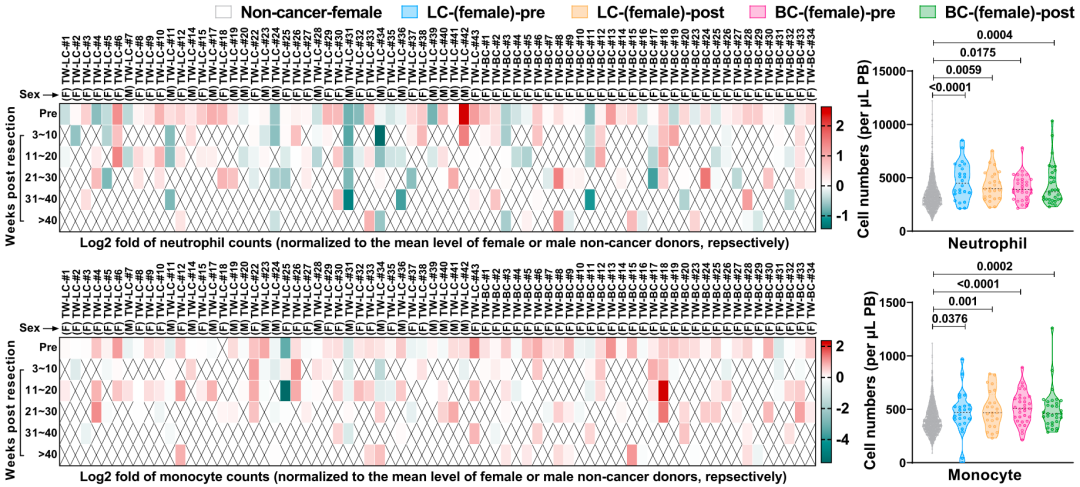 为了了解癌症患者体内是否存在类似的情况,张翔团队分析了临床样本的数据,发现与非癌症受试者相比,癌症患者(切除前)的中性粒细胞和单核细胞有所增加。让人震惊的是,乳腺癌和女性肺癌患者的中性粒细胞和单核细胞水平在肿瘤切除后长达40周的时间里处于较高的水平,不过髓系细胞没有升高;而且这种持久的效果在女性肺癌患者中似乎更为明显。