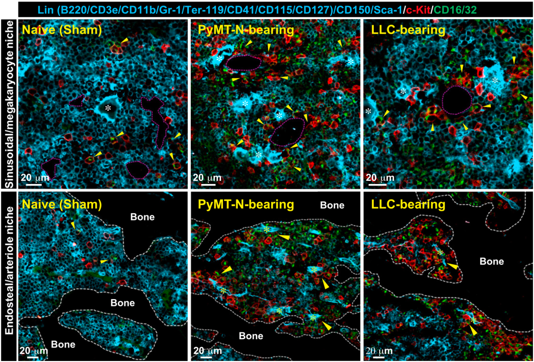 我们都知道,造血干细胞和祖细胞(HSPCs)的分化受到周围环境的严格调控。然而,在PyMT-N和LLC小鼠模型中,张翔团队发现造血干细胞错位,没有待在它该待位置,而且它的位置被CD41阴性的粒细胞-单核细胞祖细胞(GMPs)入侵,甚至完全被CD41阴性GMP取代。基于此,他们认为,这种现象就是异常造血的根源。