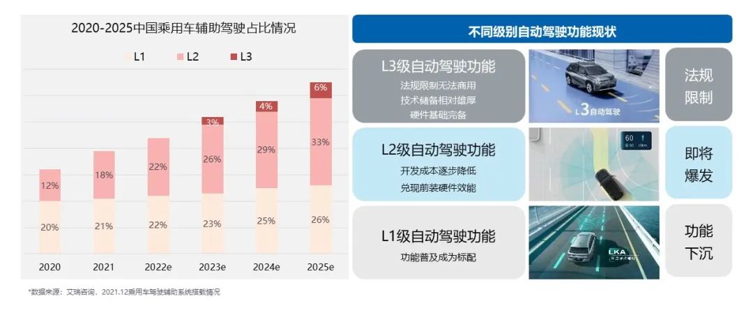 随着辅助驾驶功能的量产普及,辅助驾驶系统逐渐成为行业标配,由于L1级别功能尚未完全发挥硬件效能,L2的成本不断下降且技术能力日渐提升,未来L2将取代L1成为主流,而L3也将随着L2的日渐成熟及法规的完善而更快落地。