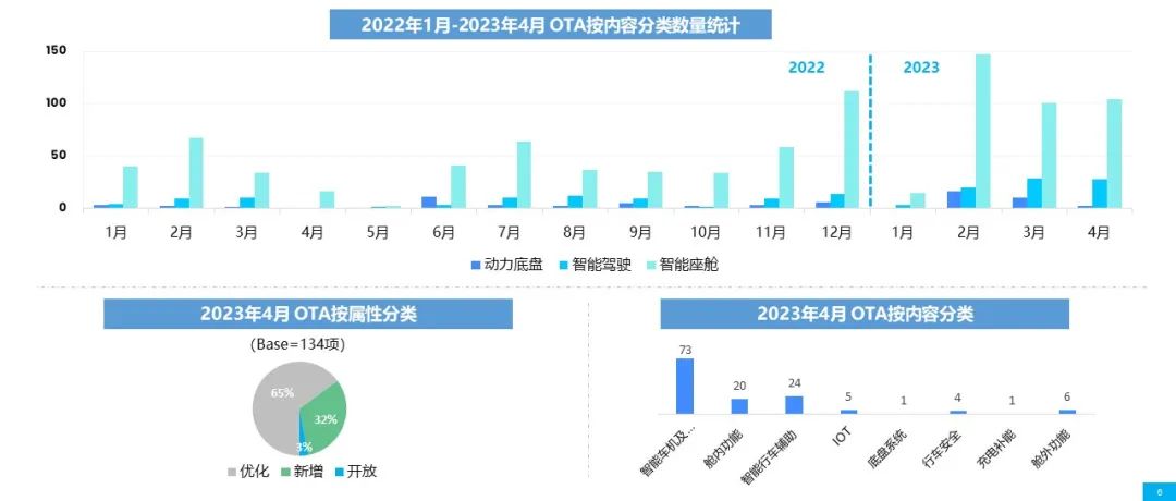 2023年4月,行业共计更新256项功能,相较上月大幅下降。智能车机及仪表作为升级内容最多的模块,也是环比下降最大的模块,主要原因是头部几个新势力品牌没有像上月一样推送多个OTA版本。