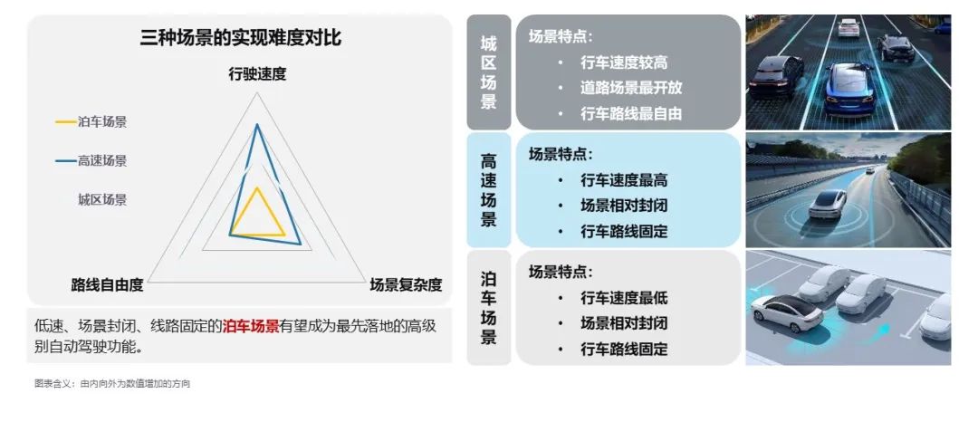 车辆的行驶速度、路线自由度、场景复杂度三个维度来衡量高级别自动驾驶功能的实现难度,则泊车将成为最快的落地场景,其次是高速,城区则相对最为困难。