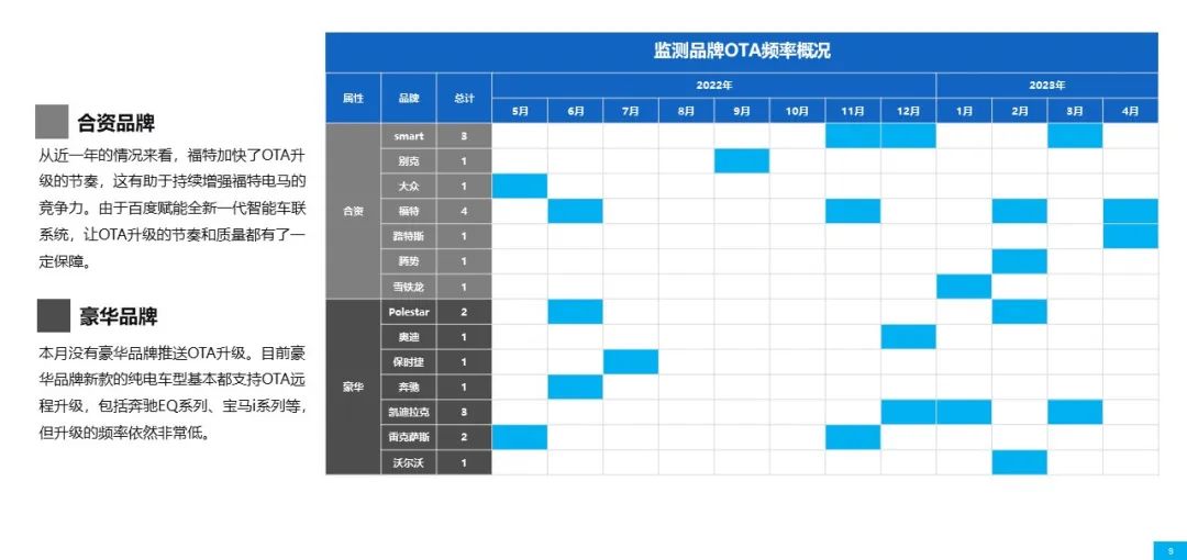 OTA月报,是以全市场OTA升级信息为基础,通过智见OTA平台,进行解析测评、专家解说、车主反馈、数据分析等模块,梳理出的全面行业OTA研究报告(本报告为简约版)。