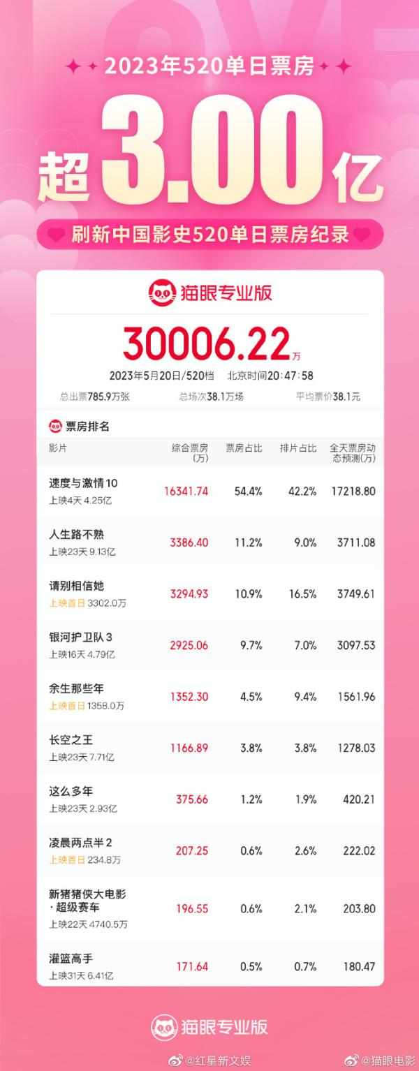 近日消息息,猫眼专业版数据显示,2023年5月20日单日票房超3亿,刷新中国影史520单日票房纪录。