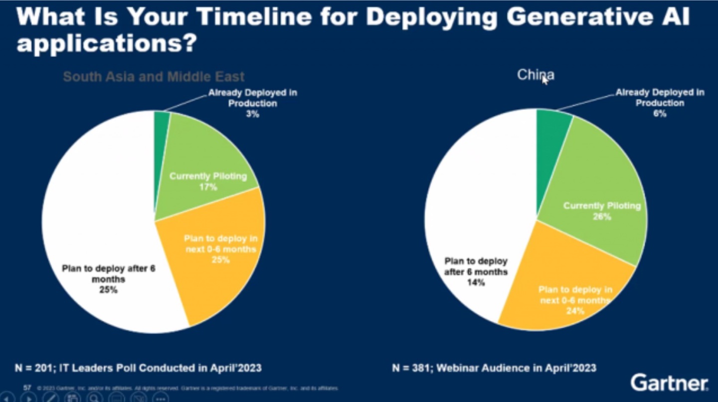 该调查结果还显示,在中国有 6% 的用户已经成功部署了与生成式 AI 相关的技术,有 26% 的用户正在积极试点生成式 AI 技术,另有 24% 左右的中国用户表示将在未来 0-6 个月内部署生成式 AI 相关的应用或技术。而最近没有计划或将在五六个月之后才有计划的用户比例约为 14%。相比之下,东南亚和中东地区则为 3%,中国用户相对而言走在比较前面。
