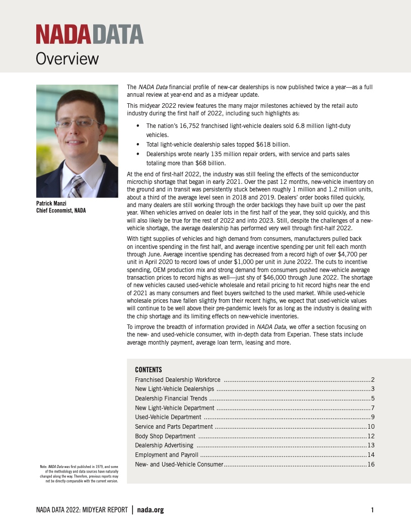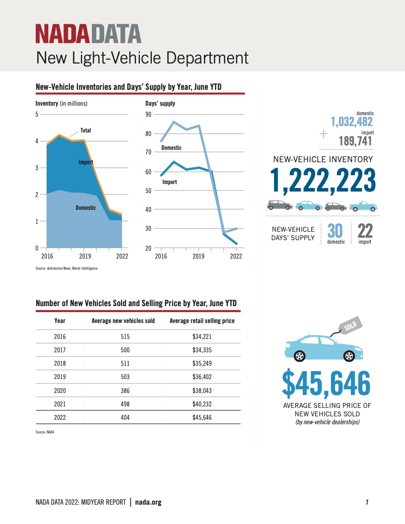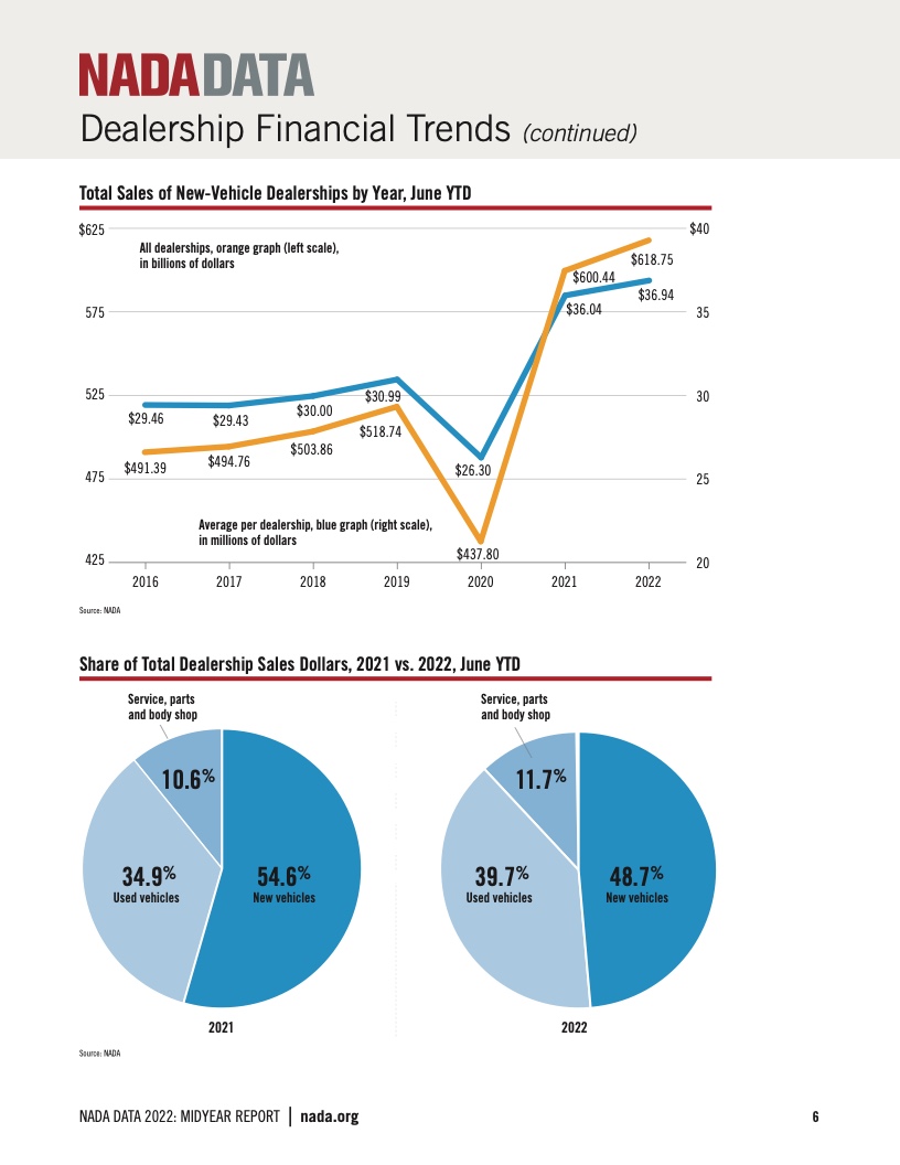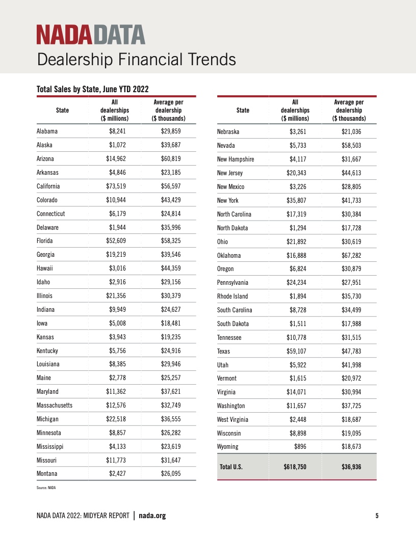 2022年全美经销商创下了自2012年以来的最低的全年销售额。尽管销量较低,但2022年是普通的特许经销商表现强劲的一年。经销商的平均销售额为7180万美元,相比之下增长了1.2%。