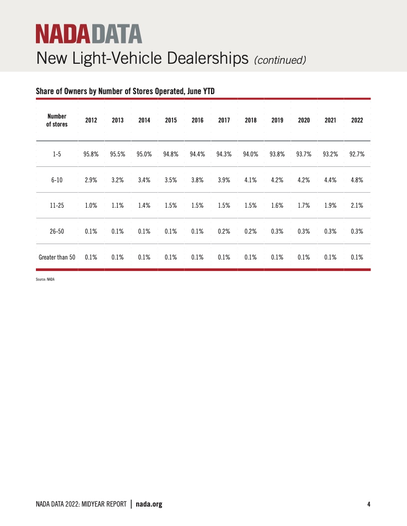从美国汽车经销商集团近十年的门店数据中可见,大于50家店的经销商集团数量仅占0.2%;占比最高的是门店数量在1~5家的经销商,达到92.4%。占比其次的是门店数量在6~10家的经销商,达到4.9%。