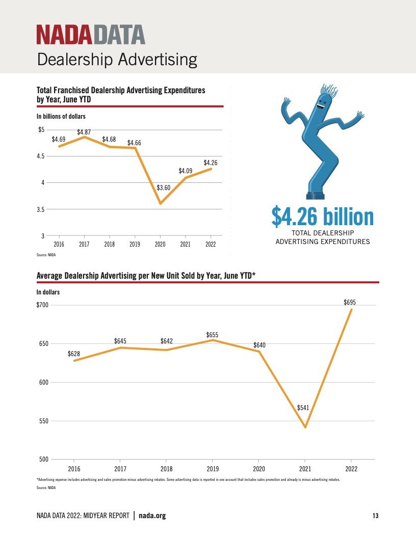 2022年,美国授权经销商广告总支出为85.7亿美元,经销商每卖一台新车历年的平均广告费支出大幅攀升至718美元,为2015年之后最高。