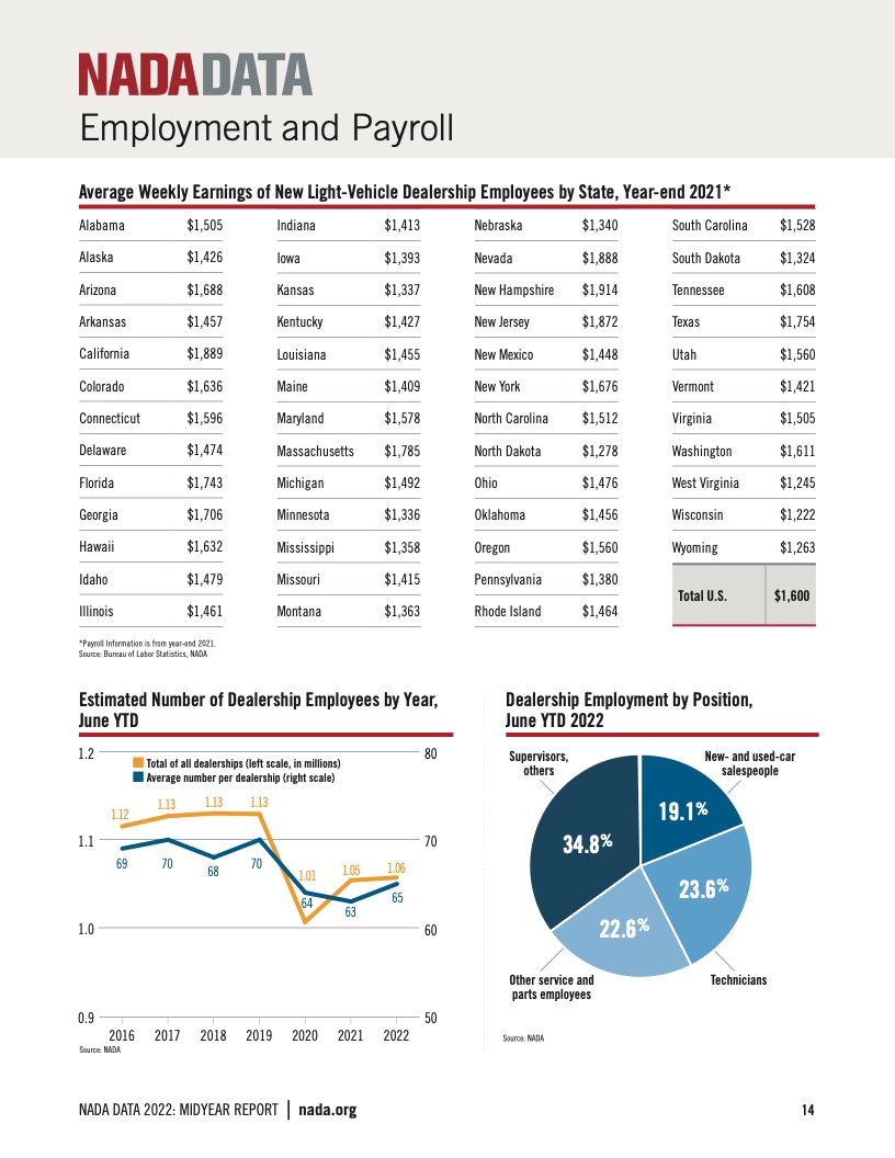 2022年,全美授权经销商的就业总人数为1,069,633人,平均每家经销商在职人数为64人。