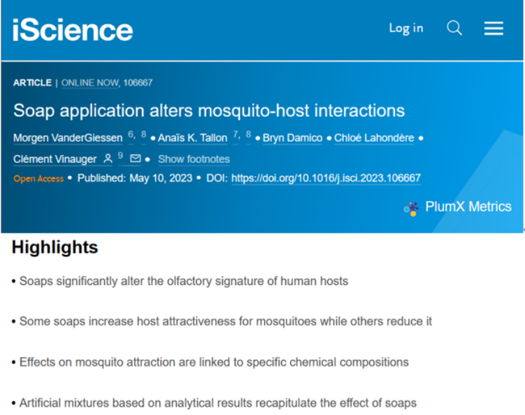 “结果令人惊讶,” 这项实验的负责人Clément Vinauger博士说:“一个原本非常招蚊子的人在使用了其中某一款沐浴露后,居然变得更招蚊子了……不过在用了另一款沐浴露后,蚊子则表现出了排斥和厌恶。”该研究成果以“Soap application alters mosquito-host interactions”为题,于5月10日发表在《交叉科学》(iScience)期刊上。