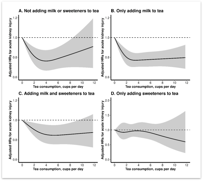 图:以添加牛奶或甜味剂茶分层,茶摄入与新发急性肾损伤(AKI)的剂量-反应关系(来源:[1])