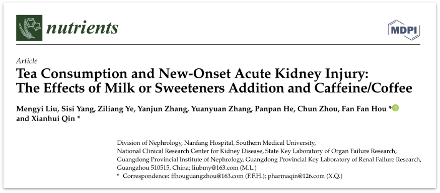 [1] Liu, M.; Yang, S.; Ye, Z.; Zhang, Y.; Zhang, Y.; He, P.; Zhou, C.; Hou, F.F.; Qin, X. Tea Consumption and New-Onset Acute Kidney Injury: The Effects of Milk or Sweeteners Addition and Caffeine/Coffee. Nutrients 2023, 15, 2201.