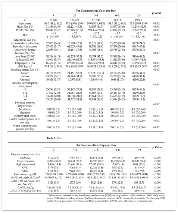 另外,饮茶与一些潜在危险因素的关系是复杂的。例如,适度饮茶者(3至5杯/天)不太可能成为吸烟者,TDI(汤森剥夺指数)、BMI和eGFR(估算肾小球滤过率)也低于不饮茶者或重度饮茶者(即≥9杯/天)。大量喝茶的人往往是男性,尿白蛋白与肌酐比值(UACR)更高,胆固醇、心血管疾病和慢性肾病的患病率更高,并且不喝茶的人往往喝更多的咖啡。