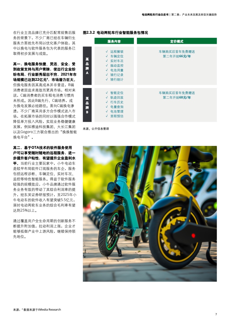 在当前成本上涨、行业薄利的情况下, 仅依靠新车销售盈利不足以支撑电动两轮车厂商的长期发展,电动两轮车行业面临着在完善客户体验的同时改善利润结构的挑战。除原材料、零部件制造等中上游产业链和终端销售等常规下游产业链外,电动两轮车正在将产业价值链延伸至用户全生命周期服务,尤其是以维修、改装、电池回收、保险、紧急救援、二手交易为主的售后服务和以公共充电、换电、车载软件服务为主的车辆衍生服务。