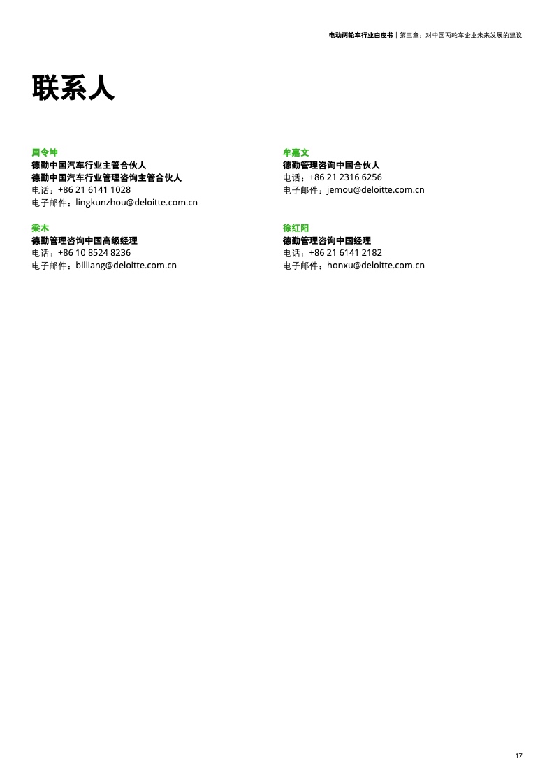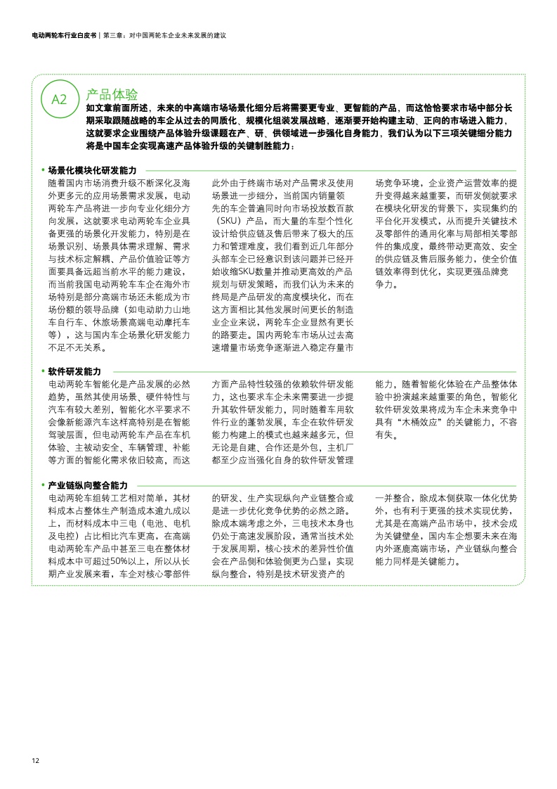 面对当前全球及国内产业发展现状及未来趋势,德勤认为国内电动两轮车企业想要在下一阶段更激烈的竞争中胜出,应在制造业研、产、供、销四大能力域中进一步识别未来需要强化和新构建的关键细分能力点,并最终通过这些能力支撑面向客户的品牌、产品及渠道体验全面升级,进一步巩固保持长期竞争力及市场地位。