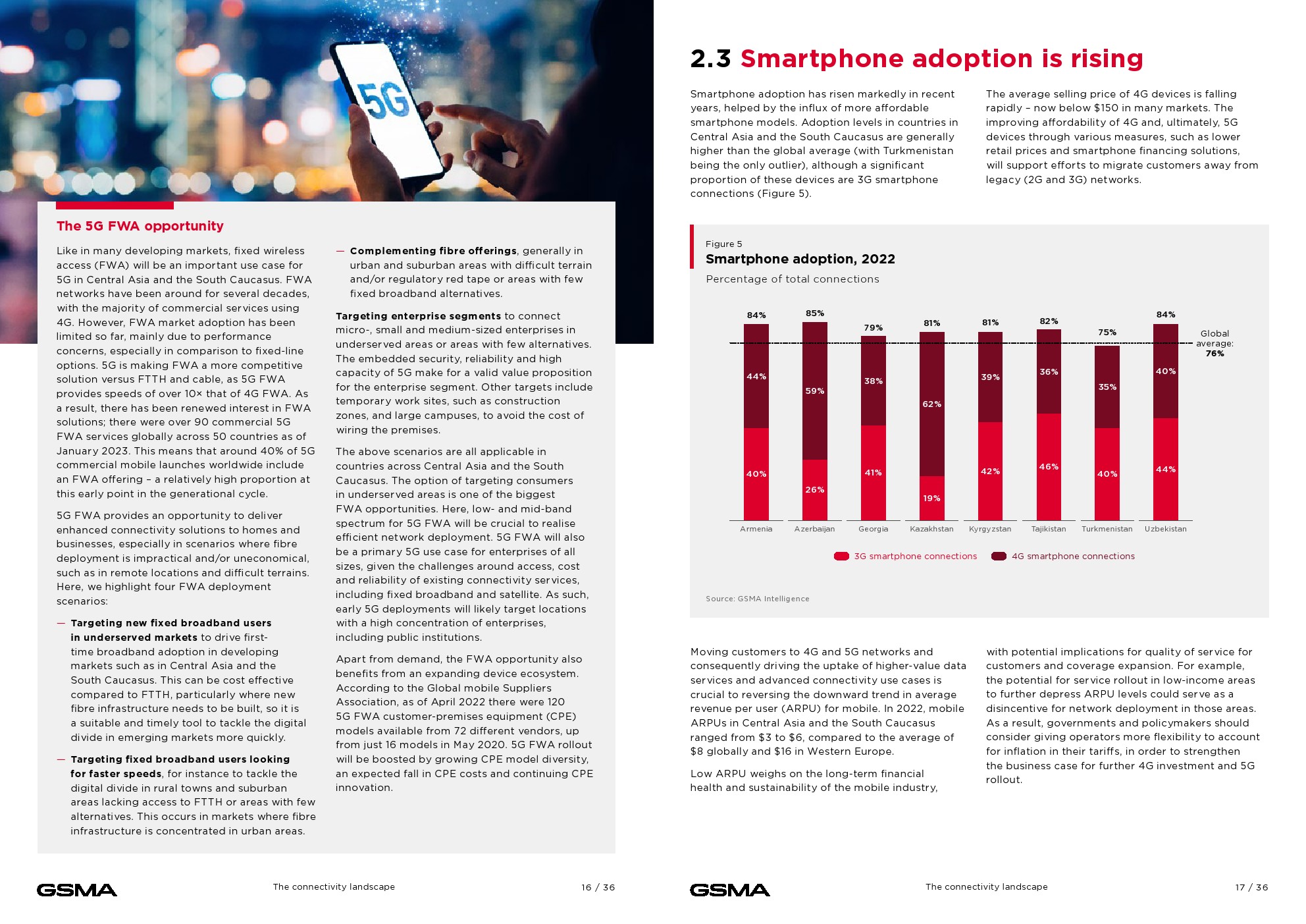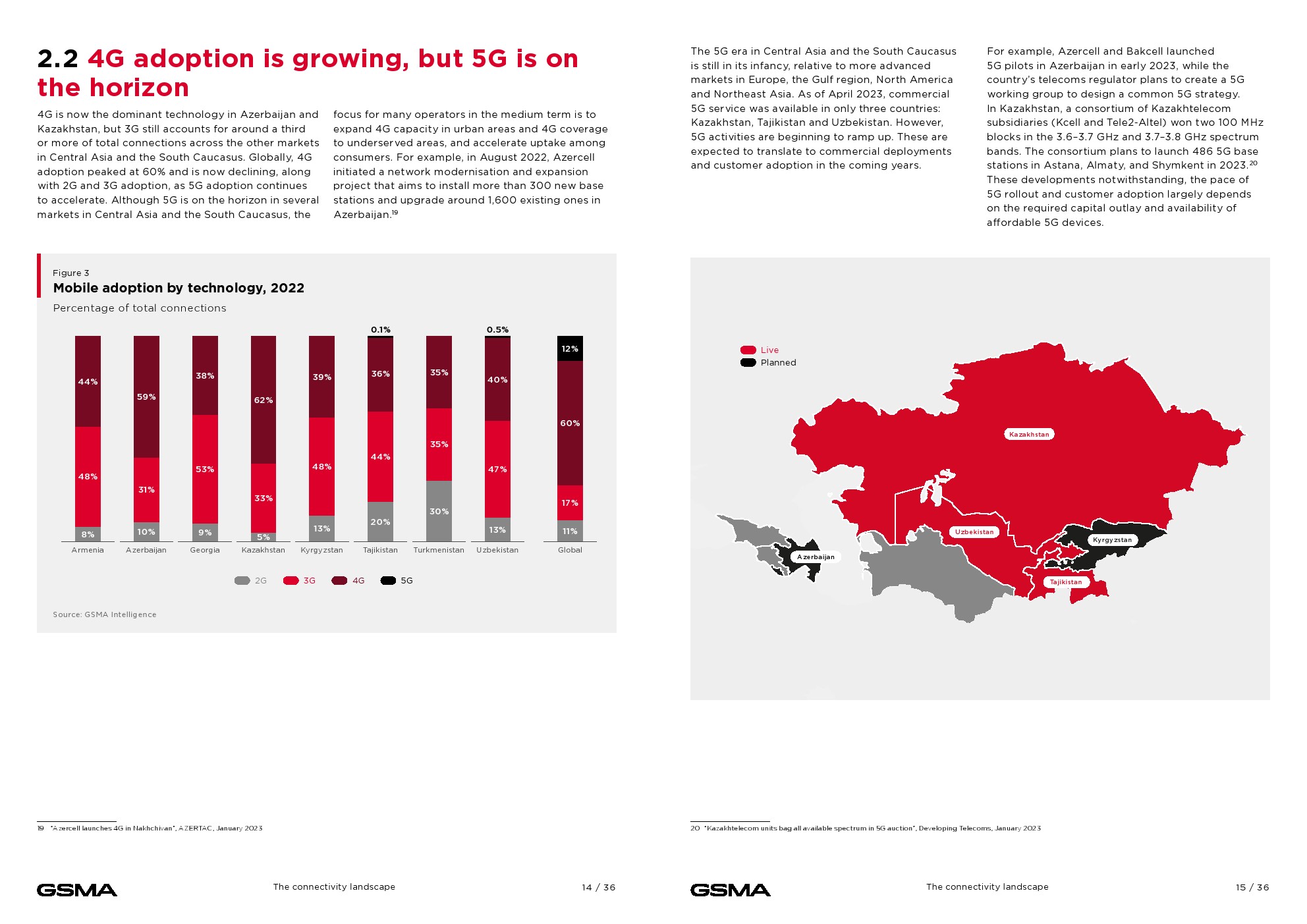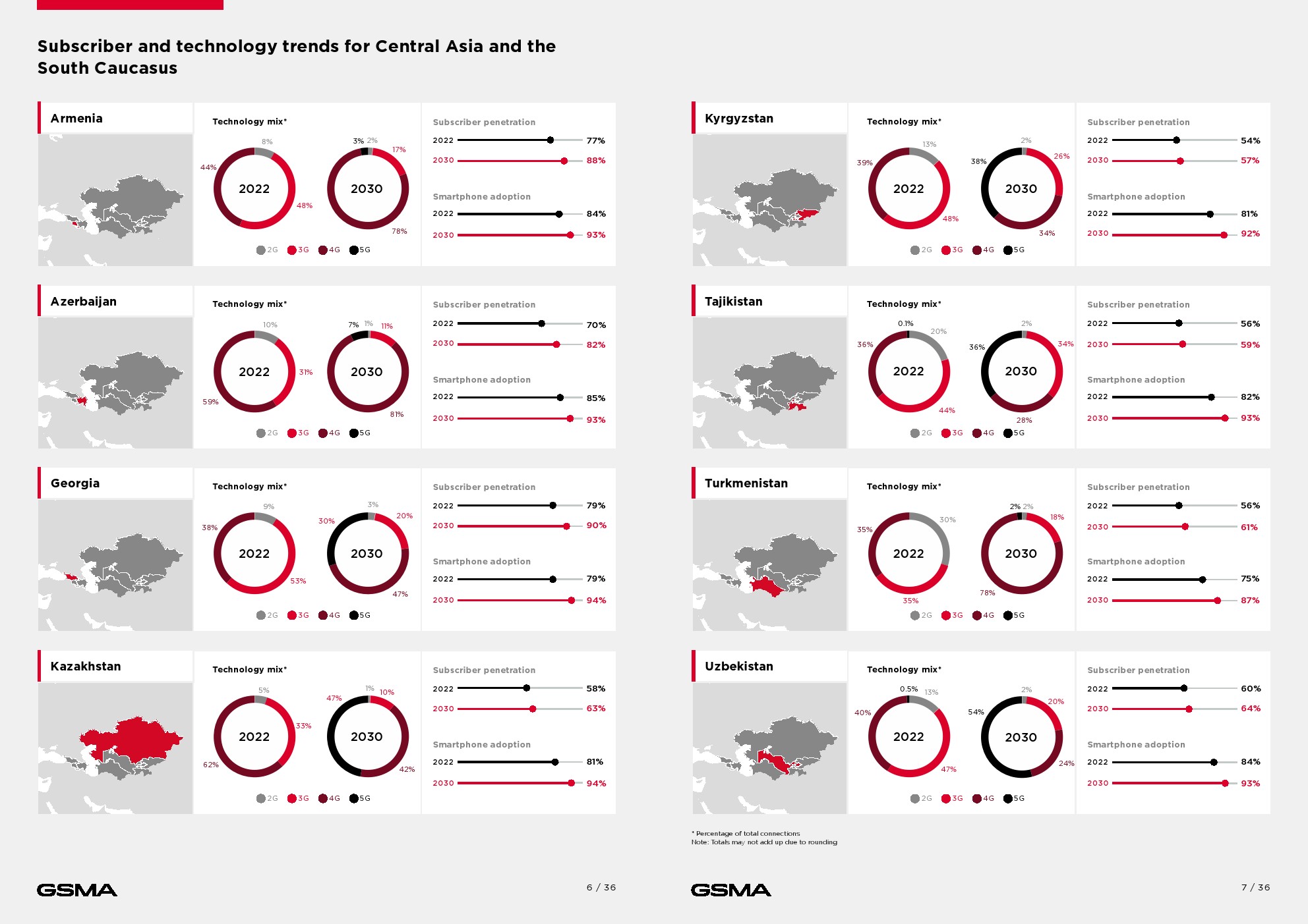 虽然4G现在是阿塞拜疆(59%)和哈萨克斯坦(62%)的主导技术,但3G仍占该地区总连接数的40%以上,而全球平均水平为17%。