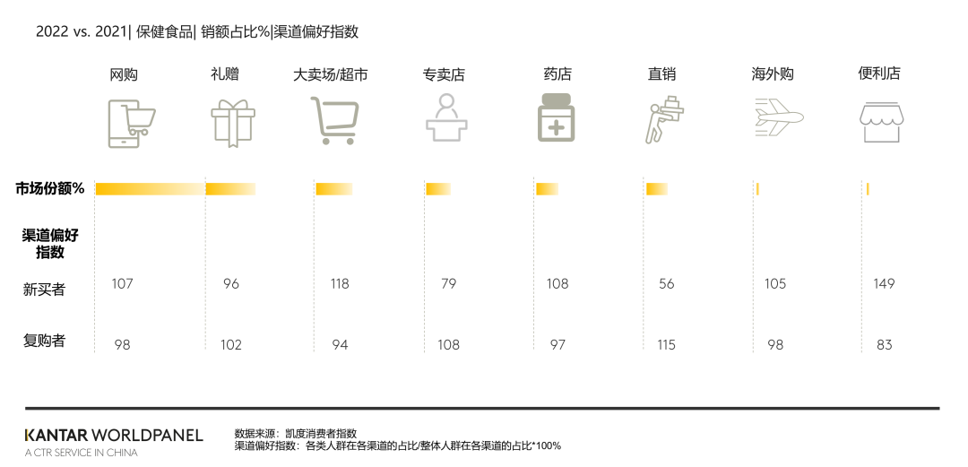 04、网购和礼赠是消费者购买保健品的主要渠道。可根据新进买者和复购者的渠道偏好布局产品组合