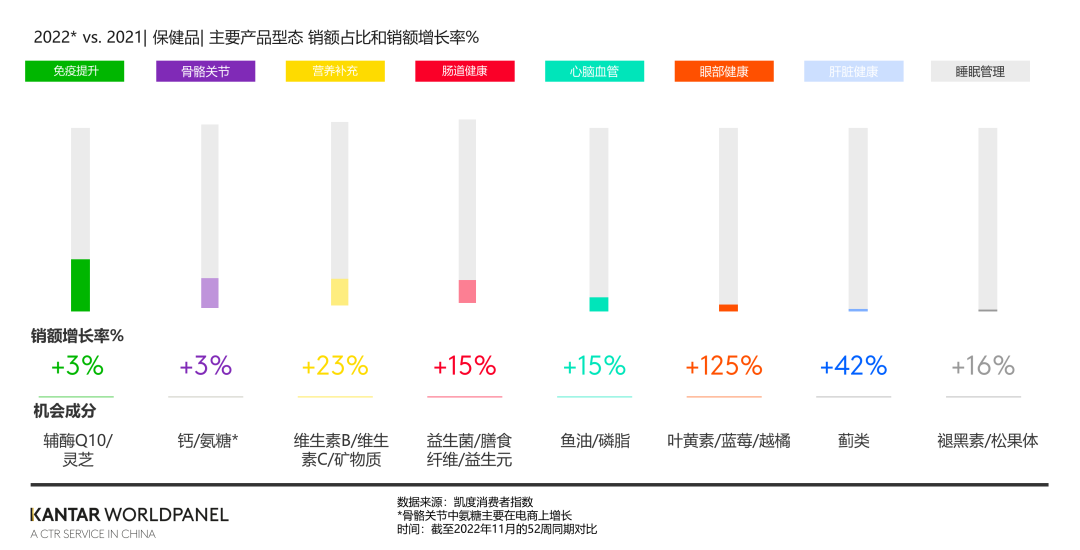 ● 凯度消费者指数(在中国隶属于CTR)数据显示,截至2022年年底,营养保健品的销售额增长率跑赢整体食品类,保持着上升势头。