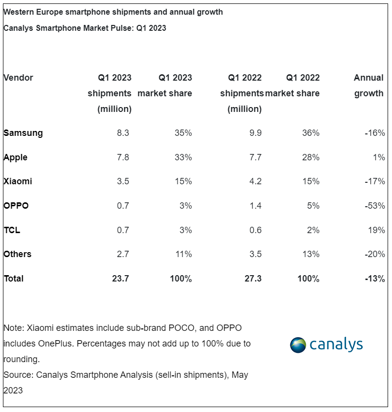 根据市场调查机构 Canalys 公布的最新数据,2023 年第 1 季度西欧智能手机市场出货量为 2370 万部,同比下降了 13%。机构认为当前已出现复苏迹象,预估 2024 年出货量会实现 6% 的反弹。