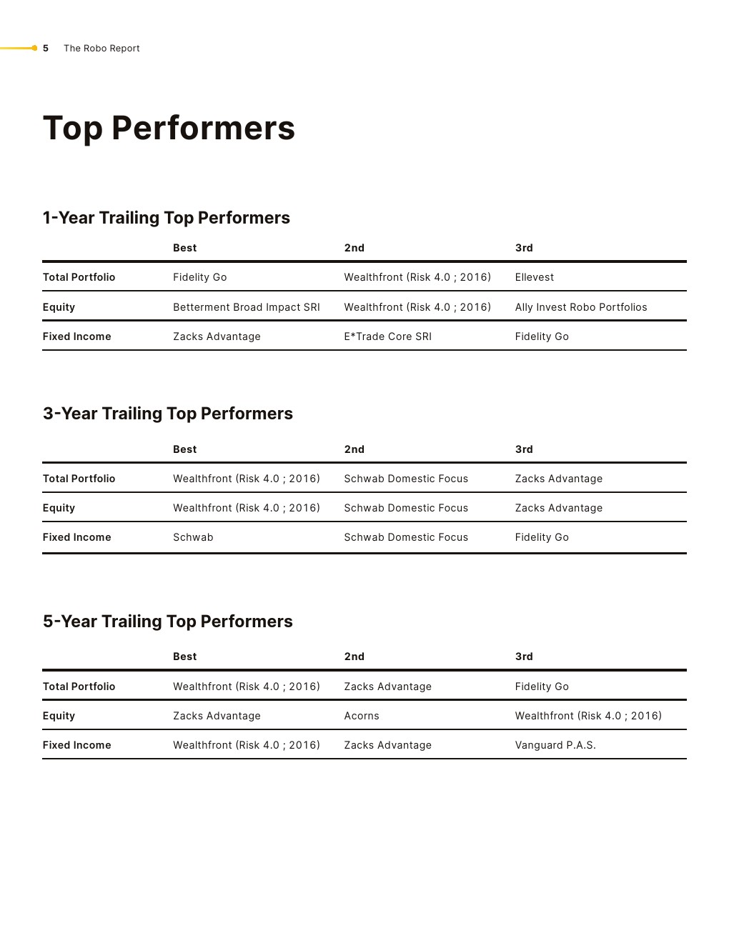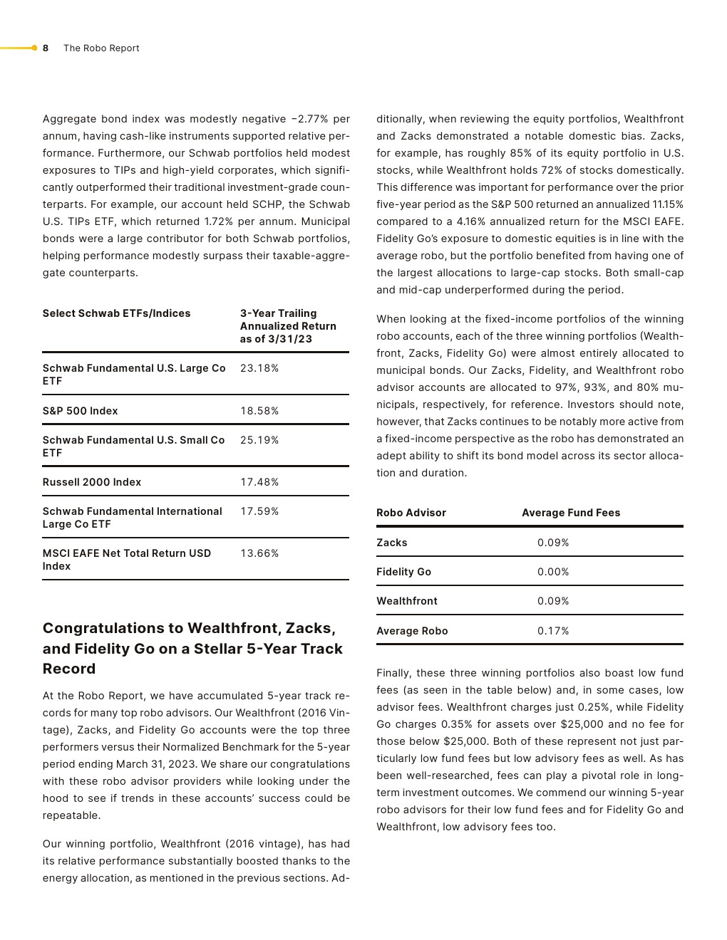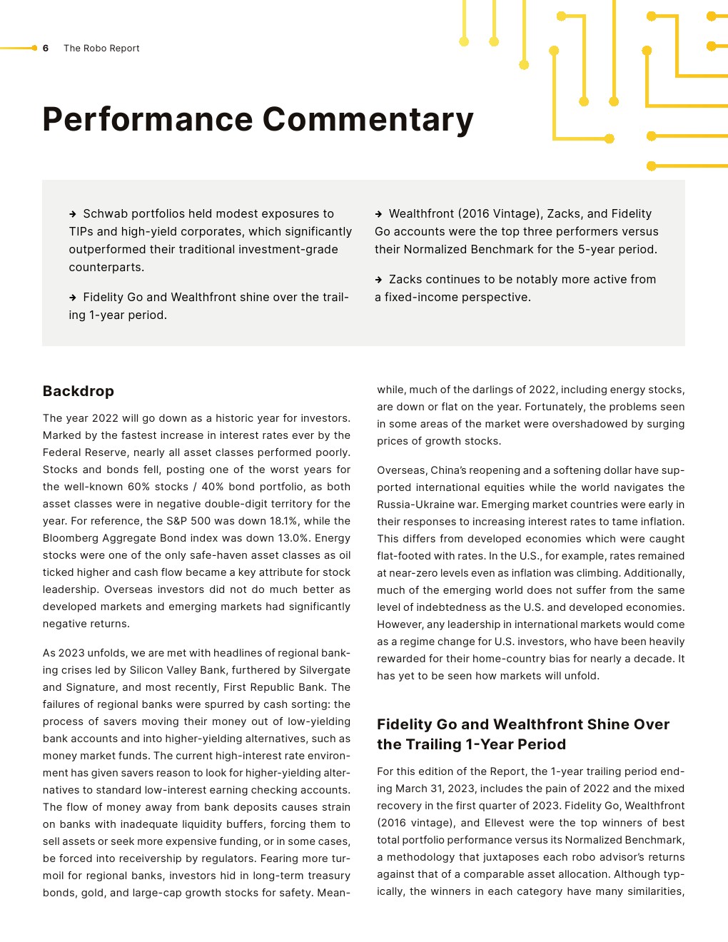 截至2023年3月31日的1年追踪期包括2022年的痛苦和2023年第一季度的混合复苏。Fidelity Go、Wealthfront(2016年份)和Ellevest是最佳投资组合的最佳赢家。虽然通常情况下,每个类别的获胜者都有许多相似之处,但有各种不同的驱动因素,最终使这些账户成为榜首。