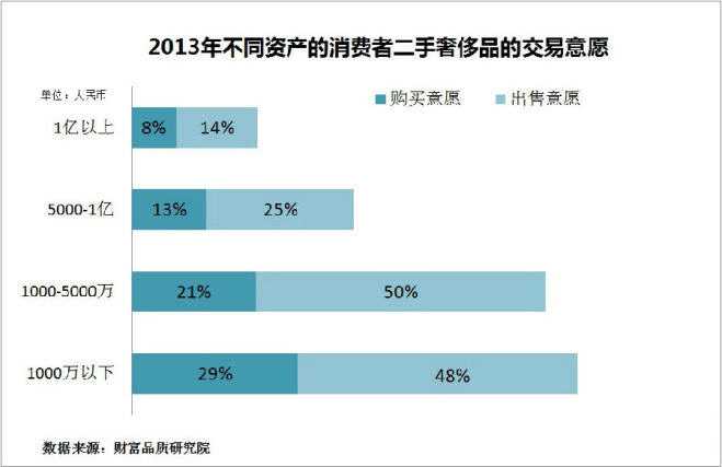 财富品质研究院调研发现,2013年资产1000万以下以及资产1000-5000万人民币之间的两大群体,出售二手奢侈品的意愿大幅上升,分别上升至48%和50%,但是购买意愿显著下降,分别为29%和21%。整体上看,中国二手奢侈品市场的交易主体2013年整体进一步低资产化。