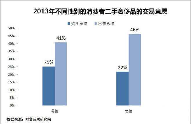 一直以来,财富品质研究院的二手消费调研中,女性群体是二手奢侈品交易的活跃消费者,但是值得关注的是,2013年男性消费者参与二手奢侈品交易的热情显著上升,购买意愿为25%,首次取代女性成为二手奢侈品交易的热衷者,出售意愿也首次突破40%,而且受访的男性消费者在二手市场出手高端腕表、皮具以及豪华车的意愿较为强烈。
