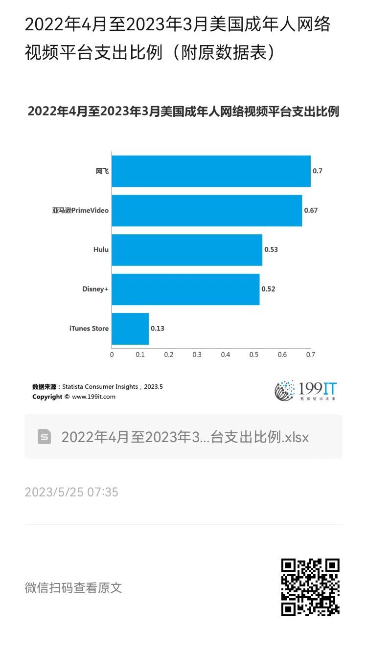 2022年4月至2023年3月美国成年人网络视频平台支出比例(附原数据表) ​​​