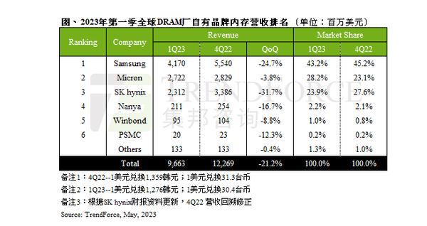 关于各大主要厂商方面,我们可以看到,三星的营收环比下跌24.7%,占据43%的市场;美国的营收环比下跌3.8%,占比28%的市场;海力士的营收下跌31.7%,占据24%的市场。