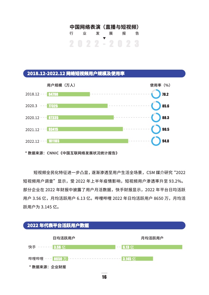 报告数据显示,2022年我国网络表演(直播与短视频)行业市场规模达1992.34亿元。在市场主体方面,截至2022年末,具有网络表演(直播)经营资质的经营性互联网文化单位有6263家。截至2022年6月,MCN机构数量(以企业营业执照数量计算)与2021年基本持平,超24000家。主播和用户方面,报告数据显示,截至2022年,主播账号累计开通超1.5亿个;内容创作者账号(指账号曾有过短视频内容创作发布行为)累计超10亿个。