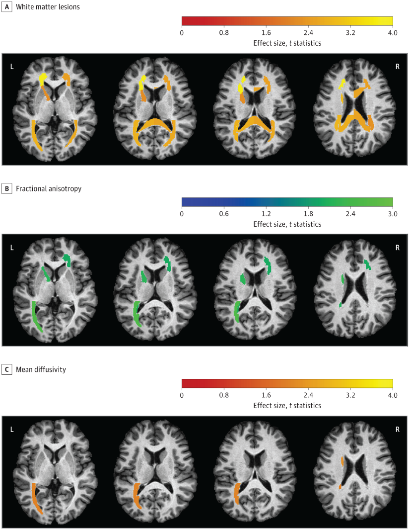 图1. (A)白质病变变化;(B)DTI各项异性分数变化;(C)DTI平均扩散系数变化