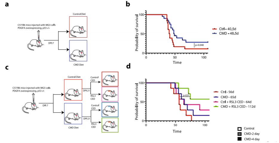 因此,这两种氨基酸也成为把控铁死亡的关键分子,而它们通常需要通过食物摄取,这就让研究者可以很好地把控个体的摄入量。在小鼠和人类神经胶质瘤细胞培养时,如果特异性地从培养基中去除两种氨基酸(CMD条件/饮食),那么肿瘤细胞铁死亡水平会迅速上升,同时其还能与GPX4抑制剂发挥协同作用,进一步增加胶质瘤细胞对铁死亡的敏感性。