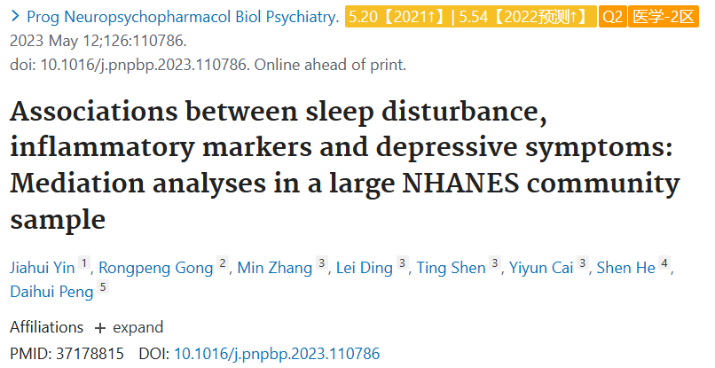2023年5月,上海交通大学的学者在《Prog Neuropsychopharmacol Biol Psychiatry》(IF=5.20)发表题为:Associations between sleep disturbance, inflammatory markers and depressive symptoms: Mediation analyses in a large NHANES community sample 的研究论文。