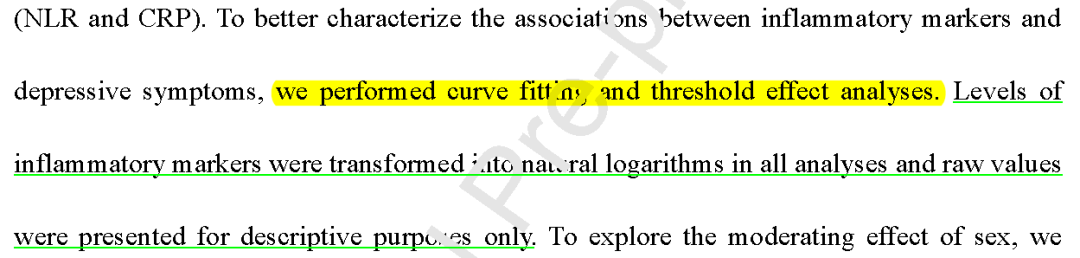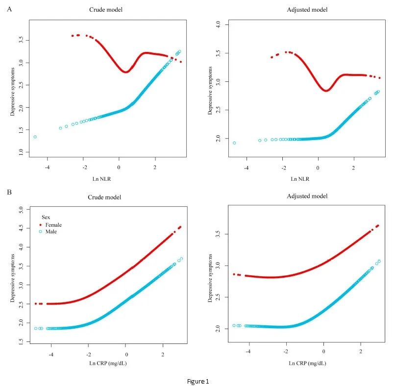 炎症标志物与抑郁症状之间的关联是非线性的。达到拐点后,抑郁症状的严重程度随着炎症标志物水平的升高而增加。