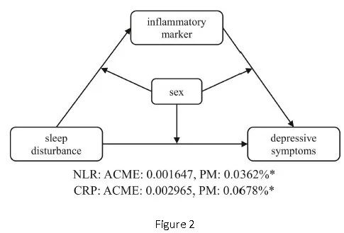 炎症标志物在男性中显著介导睡眠障碍和抑郁症状之间的关联,但在女性中没有。