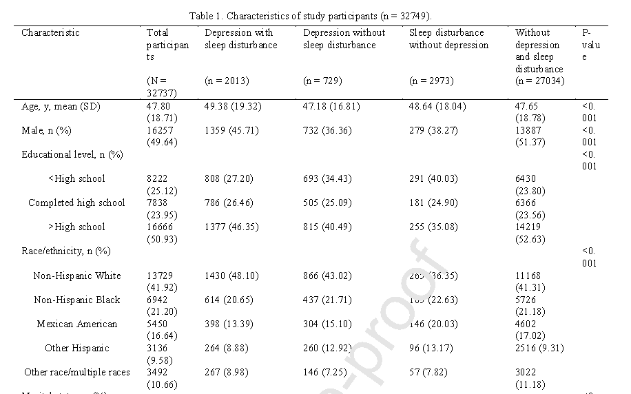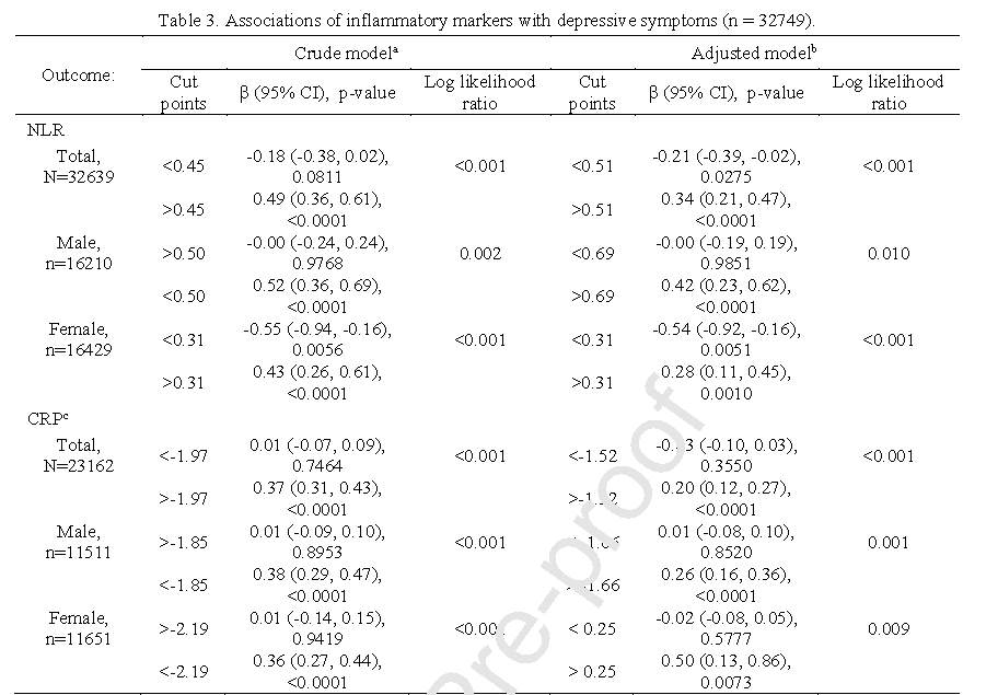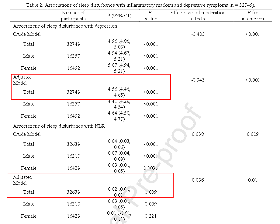 总共有32749名参与者参与了这项研究,参与者的平均年龄为47.80岁,其中49.64%为男性。15.22%的参与者有睡眠障碍,8.37%的参与者有抑郁症,中位CRP水平和NLR分别为0.42 mg/dL和2.16 mg/dL 。与没有抑郁症或睡眠障碍的参与者相比,有抑郁症和/或睡眠障碍参与者的炎症标志物水平更高。