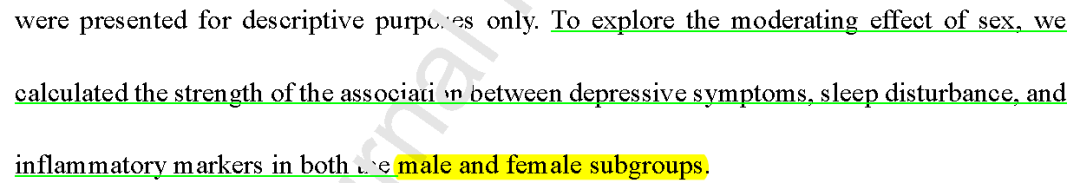 性别调节了睡眠障碍与抑郁症状之间的关系(调整后的效应大小=0.343,交互作用p值<0.001)以及睡眠障碍与炎症标志物之间的关系。女性睡眠障碍与抑郁症状之间的正相关性比男性更强。在校正了所有协变量后,睡眠障碍与男性的炎症标志物相关,但与女性无关。