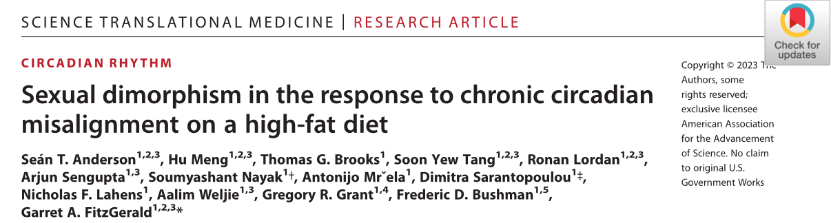 [1]Seán T. Anderson et al. ,Sexual dimorphism in the response to chronic circadian misalignment on a high-fat diet.Sci. Transl. Med.15,eabo2022(2023).DOI:10.1126/scitranslmed.abo2022