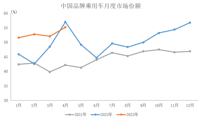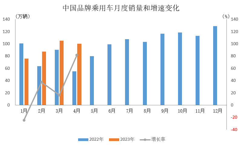 2023年4月,中国品牌乘用车销售99.9万辆,环比下降5%,同比增长81.4%,占乘用车销售总量的55.2%,占有率较上月增加3个百分点,比上年同期减少1.9个百分点。