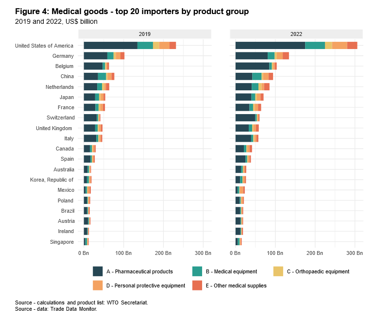 2022年,美国是最大的进口国,进口了价值3060亿美元的医疗产品(见图4)。这构成了市场的一个重要份额,占世界总量的19.2%。