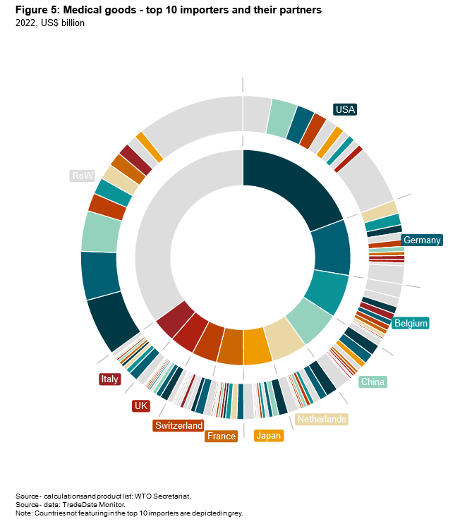 医疗产品的进口国不像出口国那样集中,前10名进口国约占世界医疗产品的三分之二,而不是四分之三。
