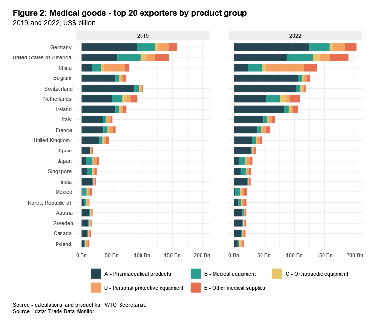 德国是医疗产品的最大出口国,而美国是医疗设备、矫形设备和其他医疗产品的最大出口国。中国是个人防护设备的最大出口国。