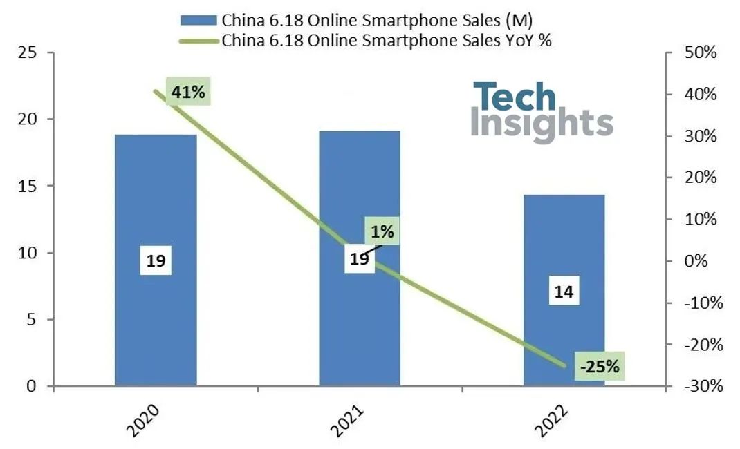 2020-2022年中国6.18网购节线上智能手机销量(百万部)及年增长率