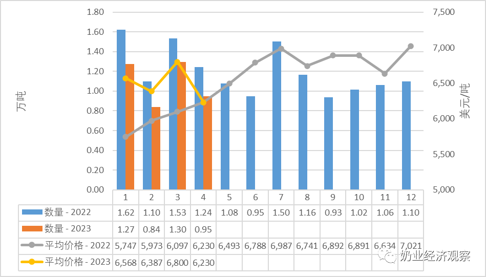 据中国海关统计,2023年4月中国共进口酸奶类0.24万吨,同比增加4.5%,进口额0.06亿美元,同比增加8.5%,平均价格为2420美元/吨,同比上涨3.8%。