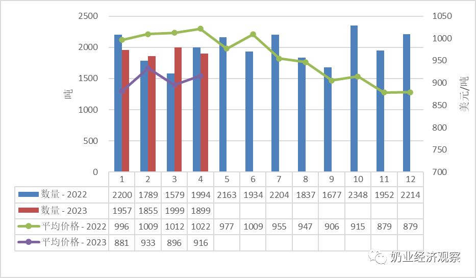 据中国海关统计,2023年1-4月中国共进口包装牛奶16.18万吨,同比减少38.3%;进口额1.7亿美元,同比减少27.7%,平均价格为1050美元/吨,同比上涨17.3%。