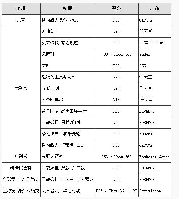 本届日本游戏大赏年度作品类大赏由日本累计出货超过460万套的《怪物猎人携带版3rd》夺得,优秀赏包括《Wii派对》、《潜龙谍影:和平先驱》等11款作品,最佳销售赏为全球累计销售1151万套的《口袋妖怪黑版/白版》,评审推荐特别赏为获得全球好评的《荒野大镖客》。